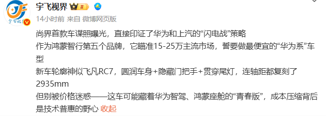值得深挖的是其背后华为与上汽的“闪电战”策略。尚界借鸿蒙智行生态,有望快速铺货、抢占市场。虽价格定位较低,但有可能搭载华为智驾、鸿蒙座舱的“青春版”。这意味着更多消费者能以相对低门槛,体验华为智能汽车技术,推动智能汽车普及,也让华为在汽车智能化赛道,通过多元价格带布局,巩固生态影响力 。